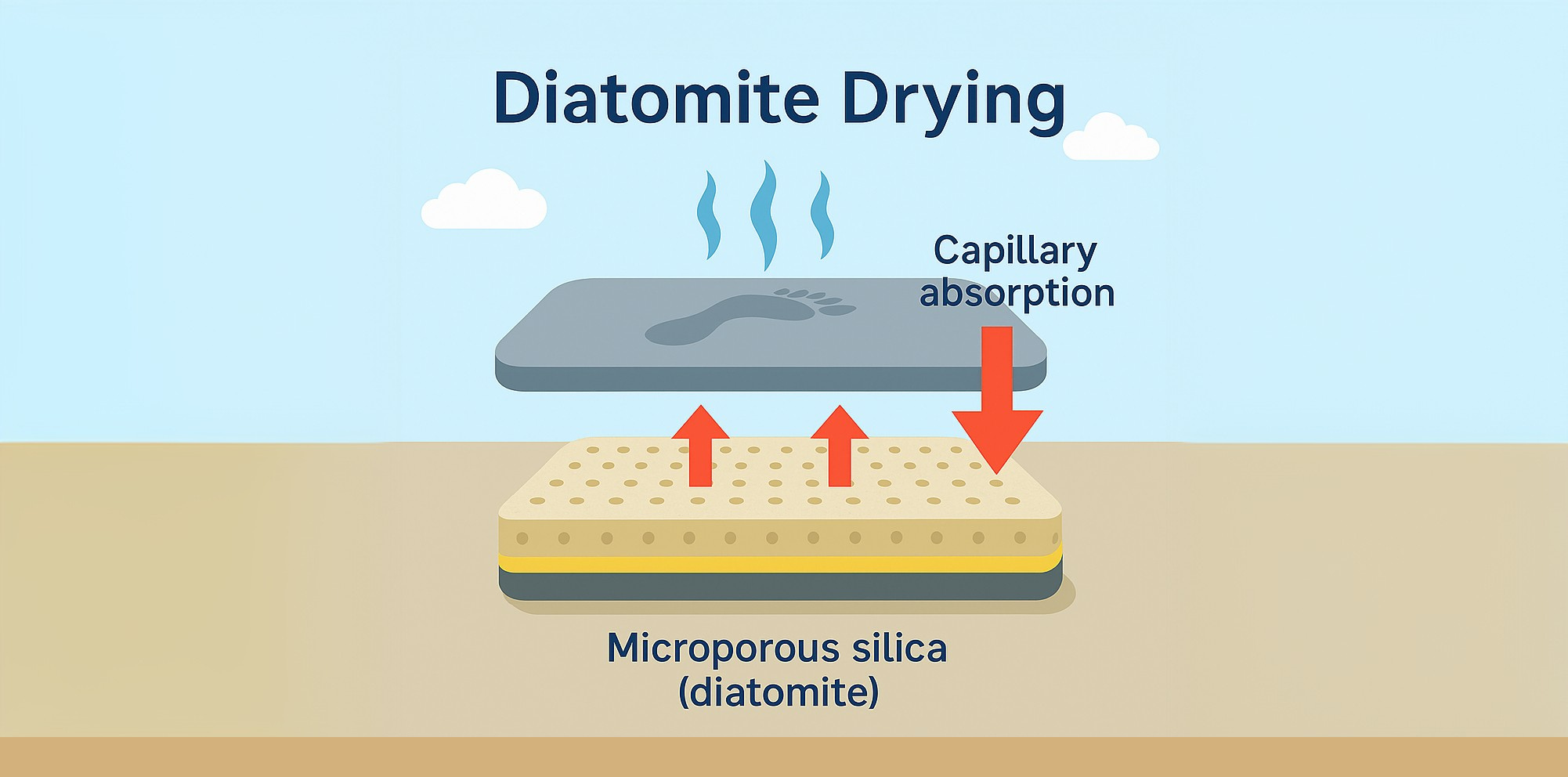 Water hits, water disappears. The diatomite pulls moisture deep into the surface so your feet and floor stay bone dry, usually in under a minute.
