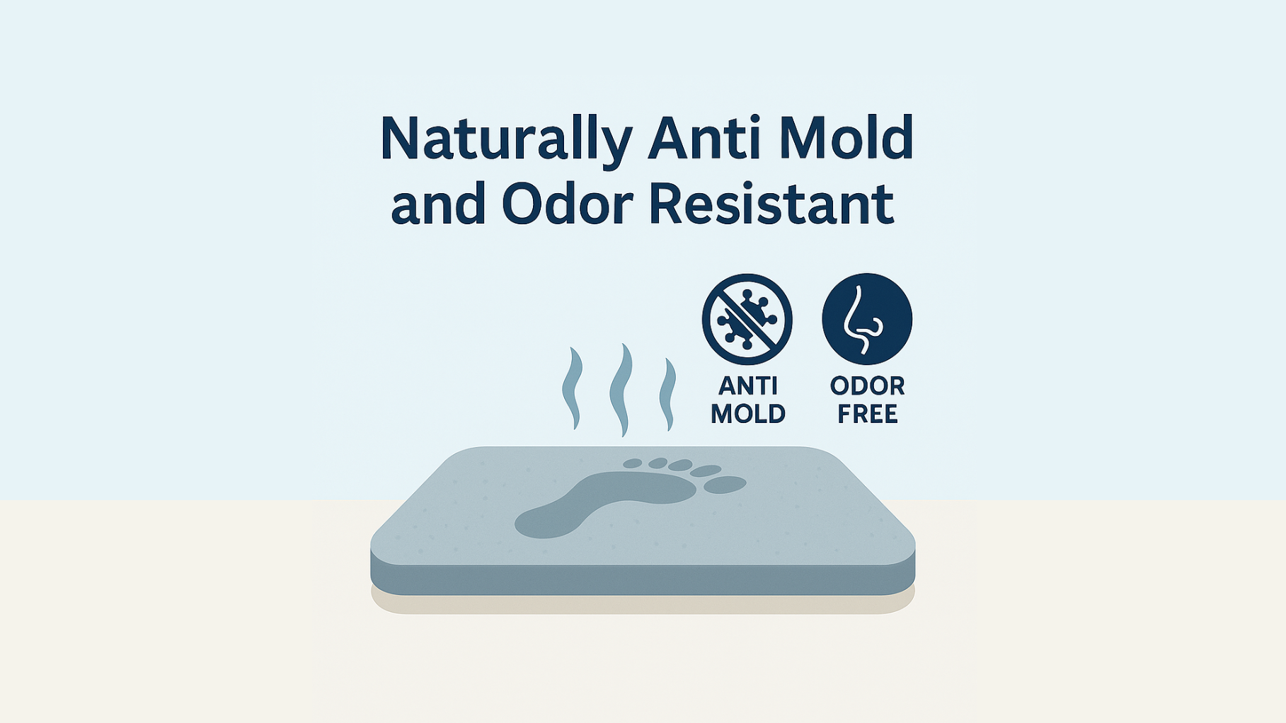 Diatomite is inhospitable to funk. Its fast drying mineral surface stops moisture from lingering, so musty smells and mildew do not stand a chance.