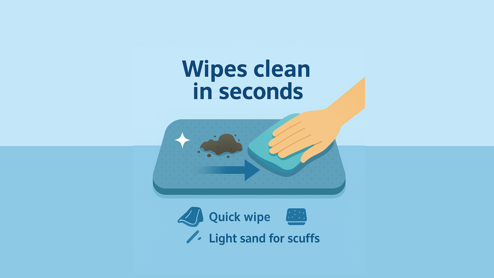 Daily upkeep is simple. A quick wipe and you are done. For scuffs, a light sand with the included pad refreshes the surface like new.